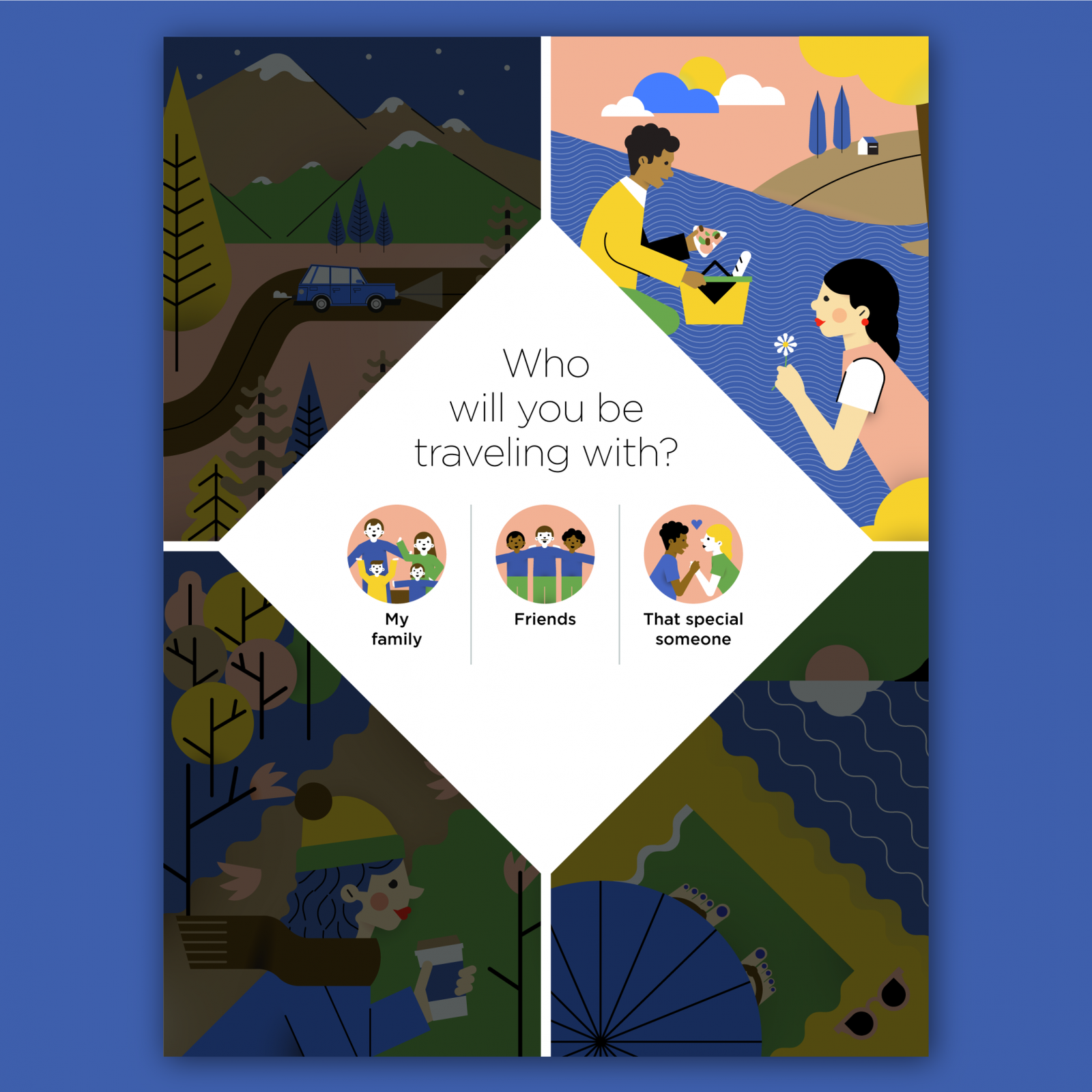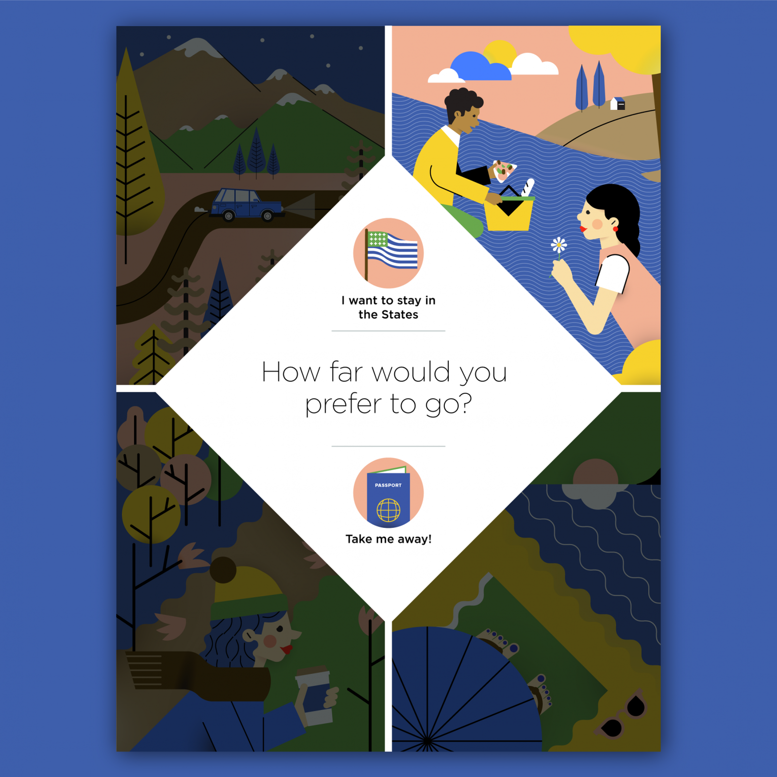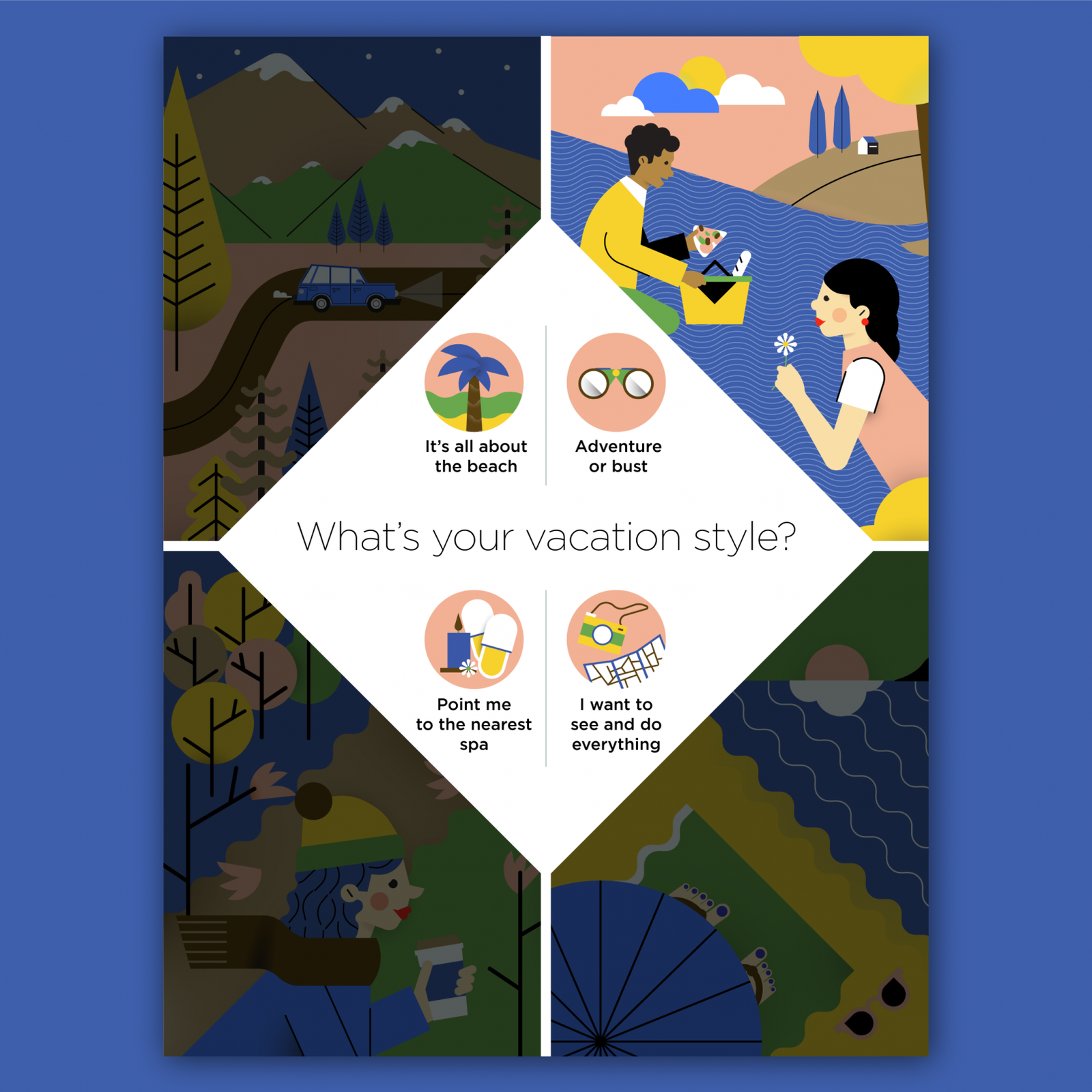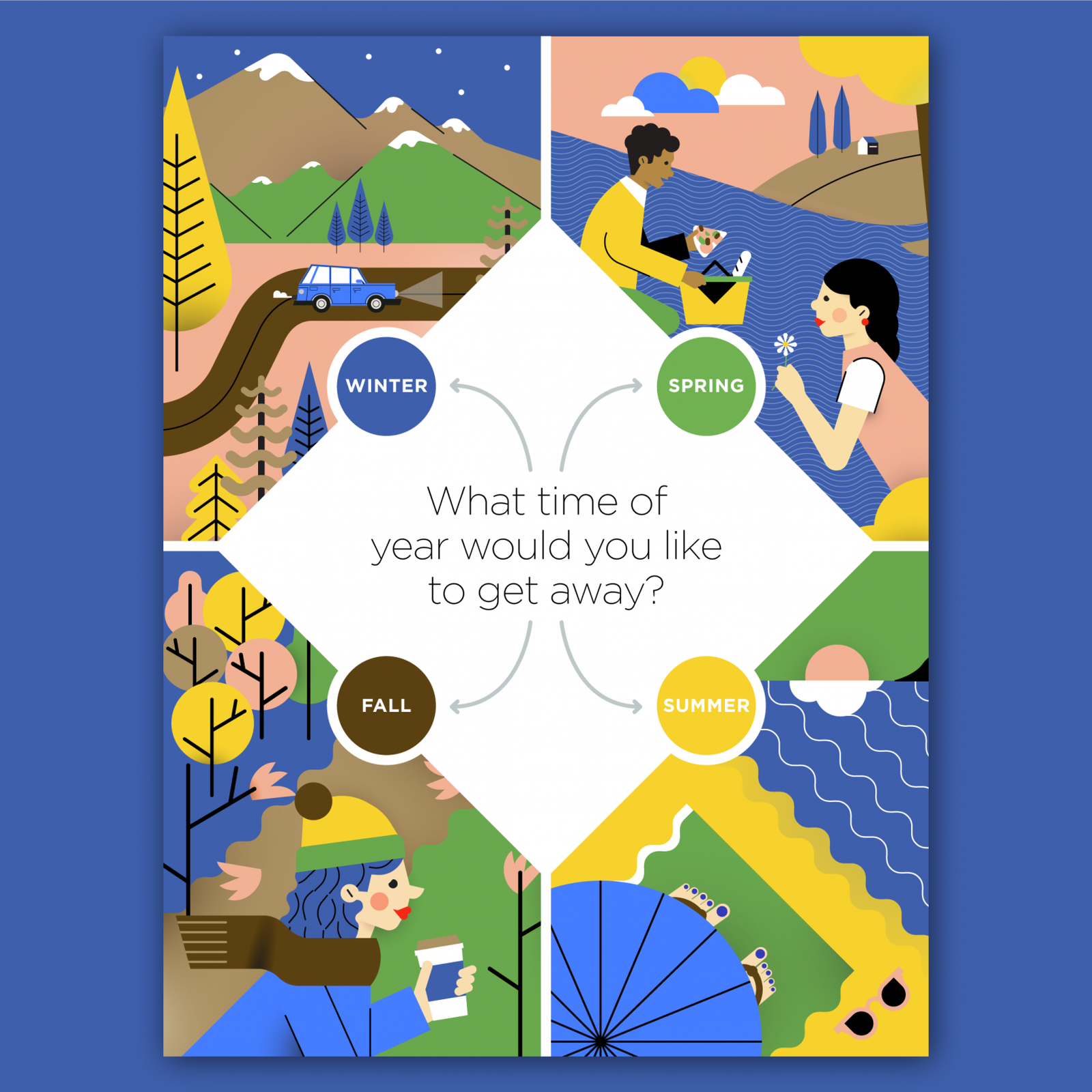 I illustrated the four seasons and the icon set below for the digital edition of Endless Vacation Magazine USA, spring issue 2017.