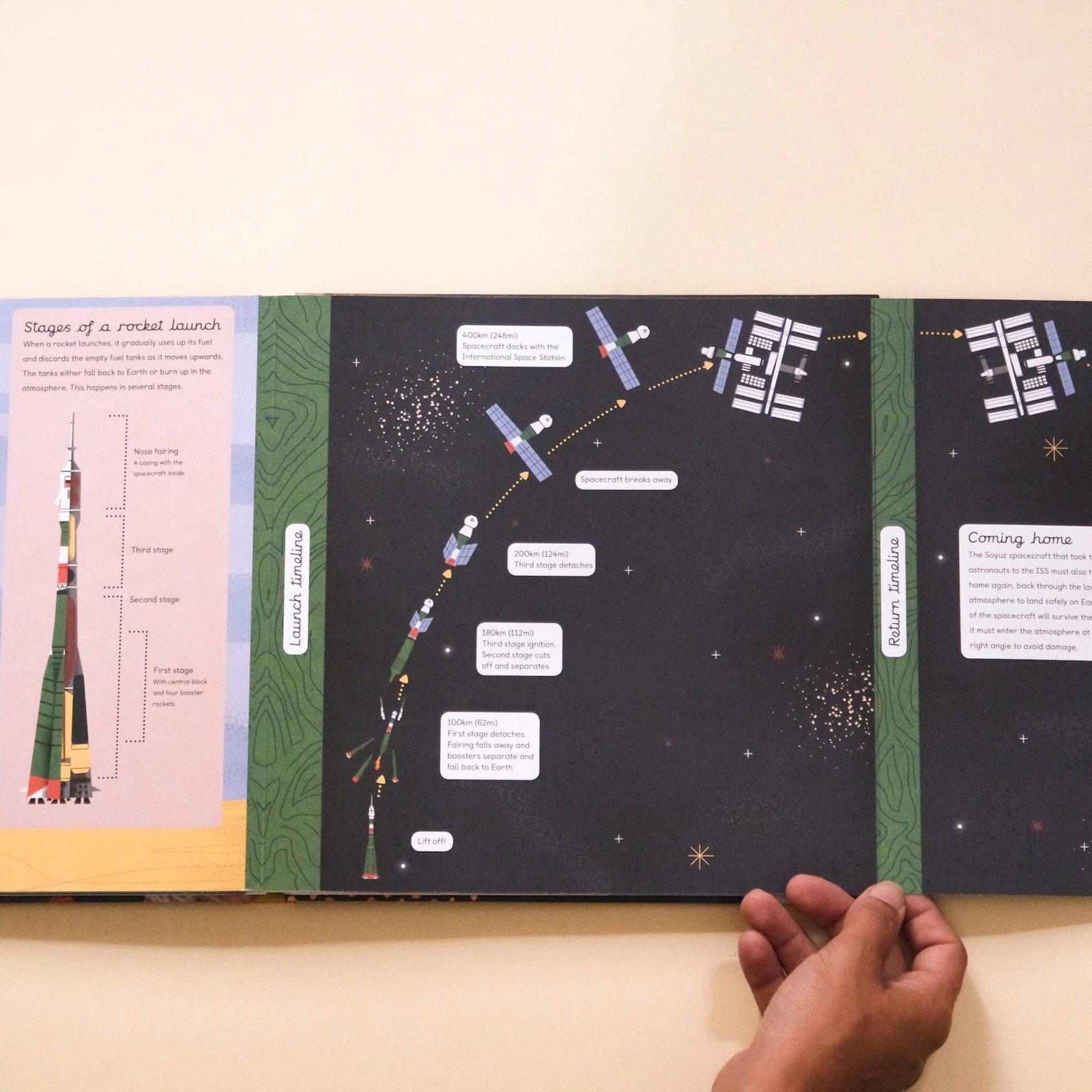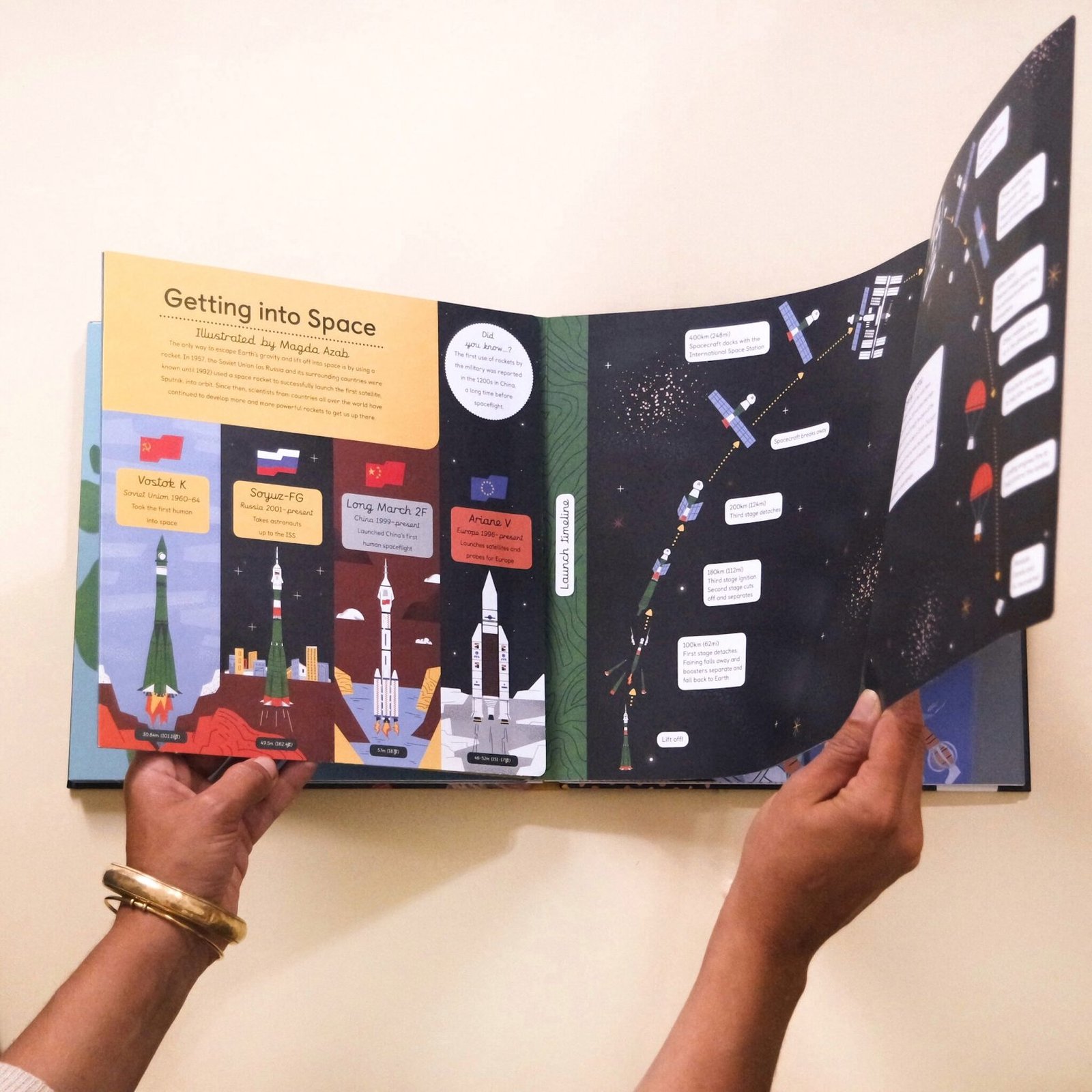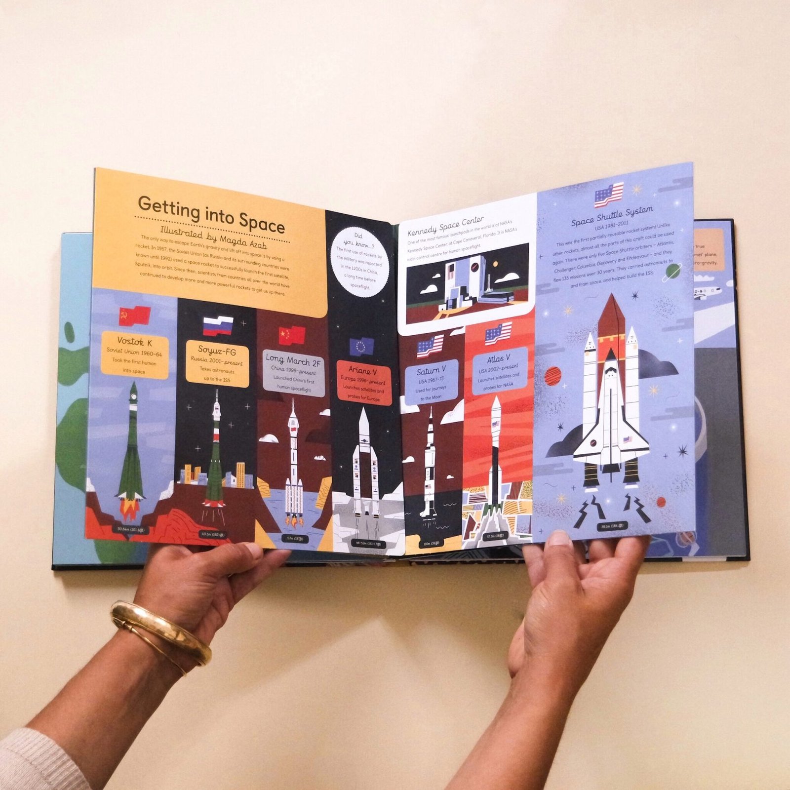 The volume explores every aspect of Space, from the big bang to the astronaut training, 10 sections for 10 different illustrators my section delve into rockets, how they work, how they’re build etc…