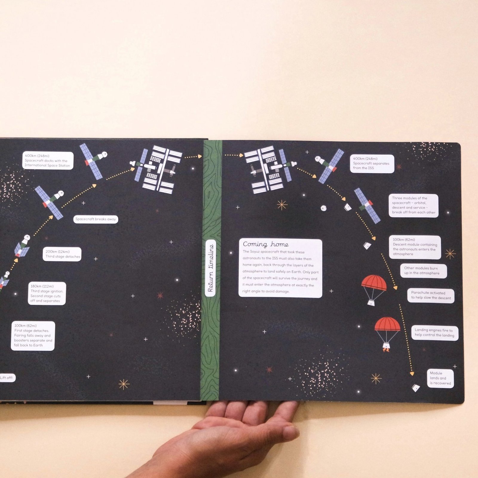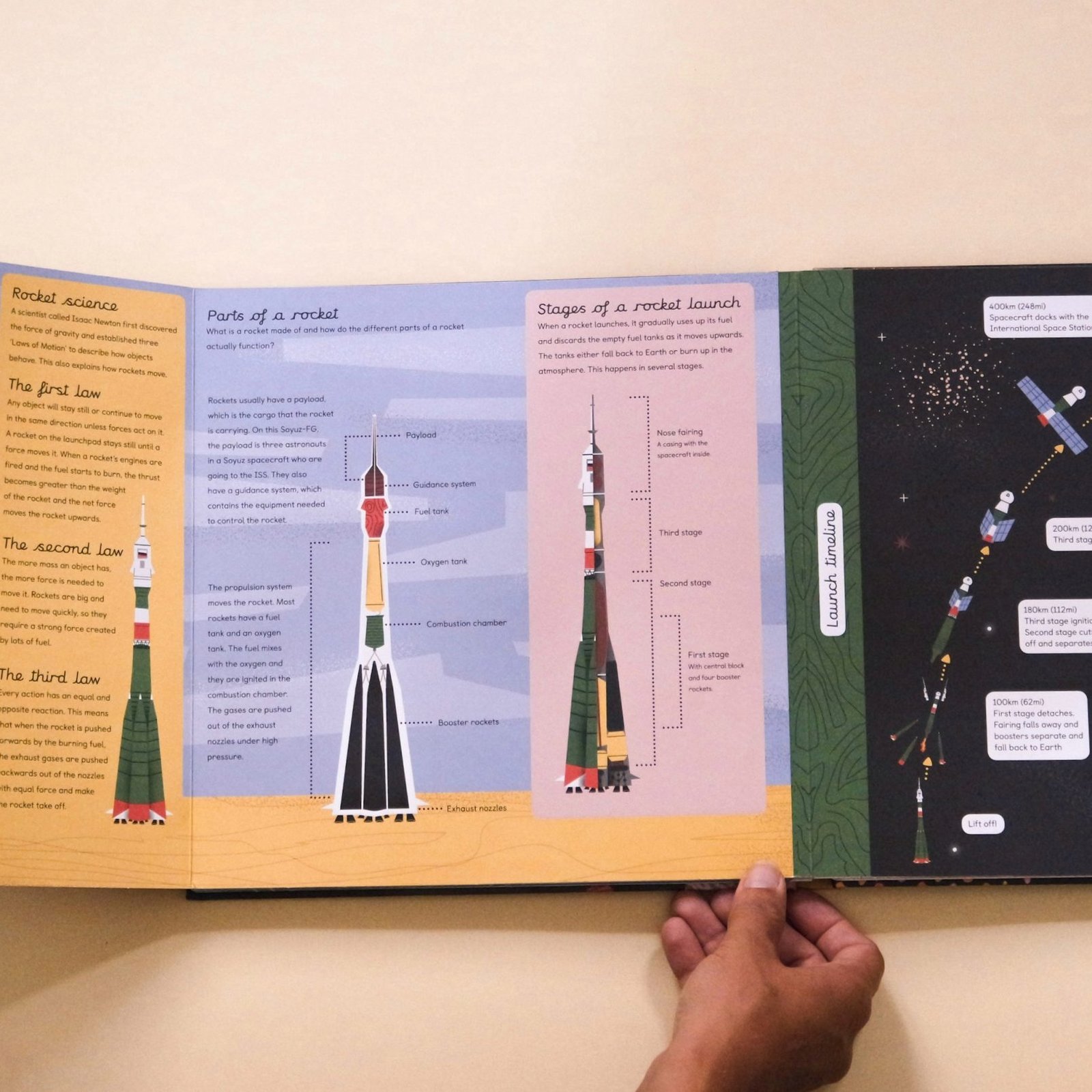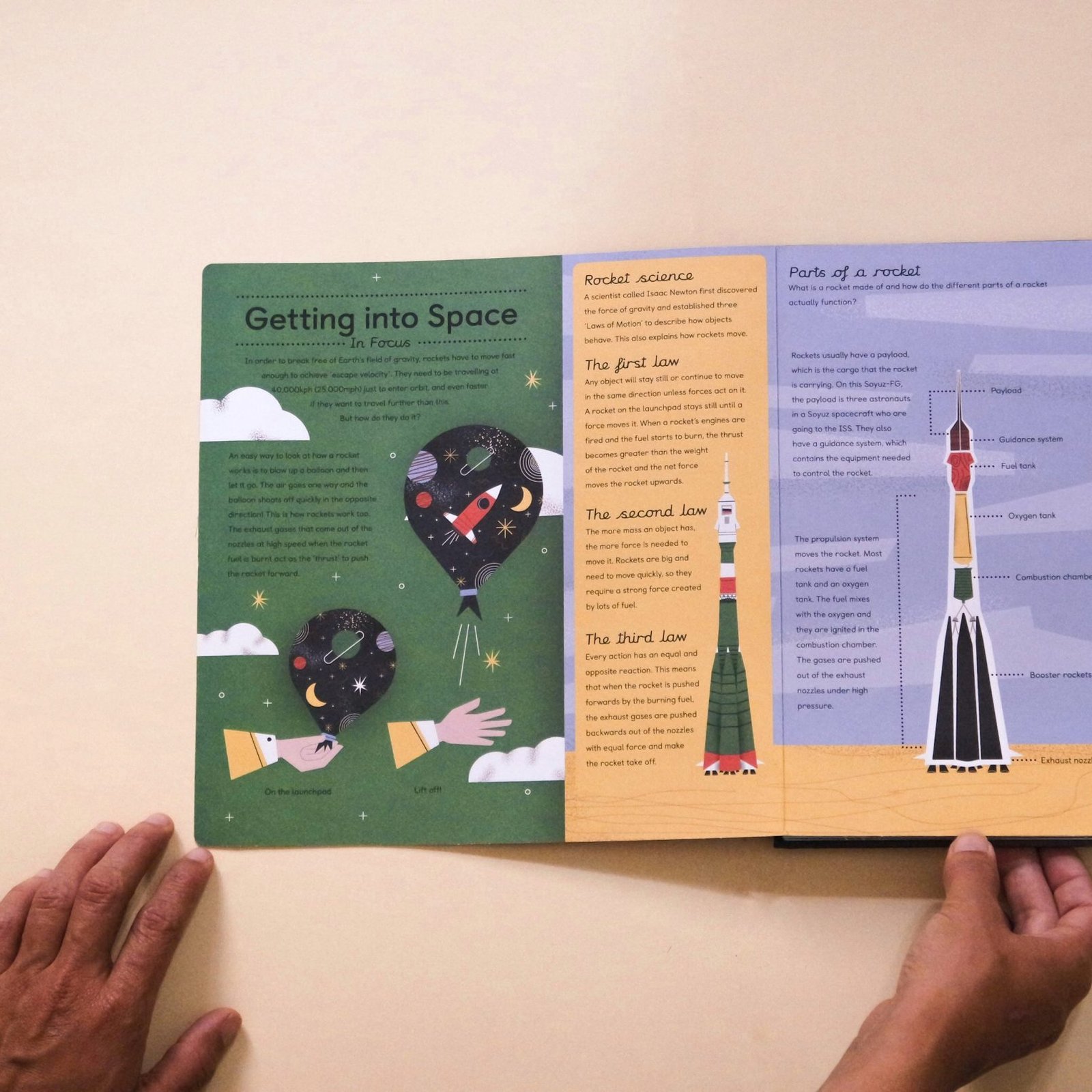 The volume explores every aspect of Space, from the big bang to the astronaut training, 10 sections for 10 different illustrators my section delve into rockets, how they work, how they’re build etc…
