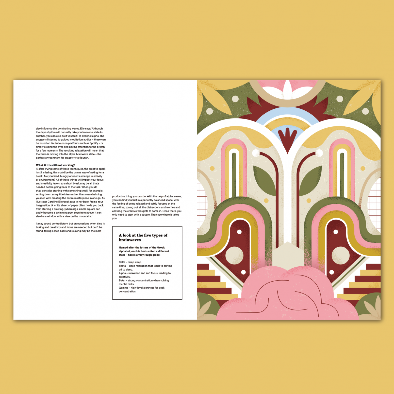 Editorial illustrations for the 24th issue of Teen Breathe Magazine, the article talks about how alpha brainwaves can enhance our focus and creativity and how can we cannel these brainwaves.